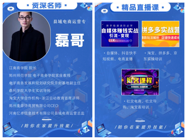 南樂縣商務局舉辦此次電商培訓直播在線開講,特別聘請江南商學院院長、鄭州師范學院電子商務學院客座教授、淘寶大學合作機構-浙江云動教育首席講師王磊在線釋疑解惑,課程內容主講自媒體、抖音快手短視頻、電商直播等精品直播課。